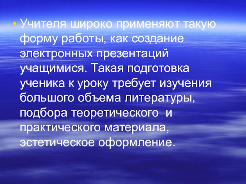 Слайд 10Учителя широко применяют такую форму работы, как создание электронных презентаций учащимися.