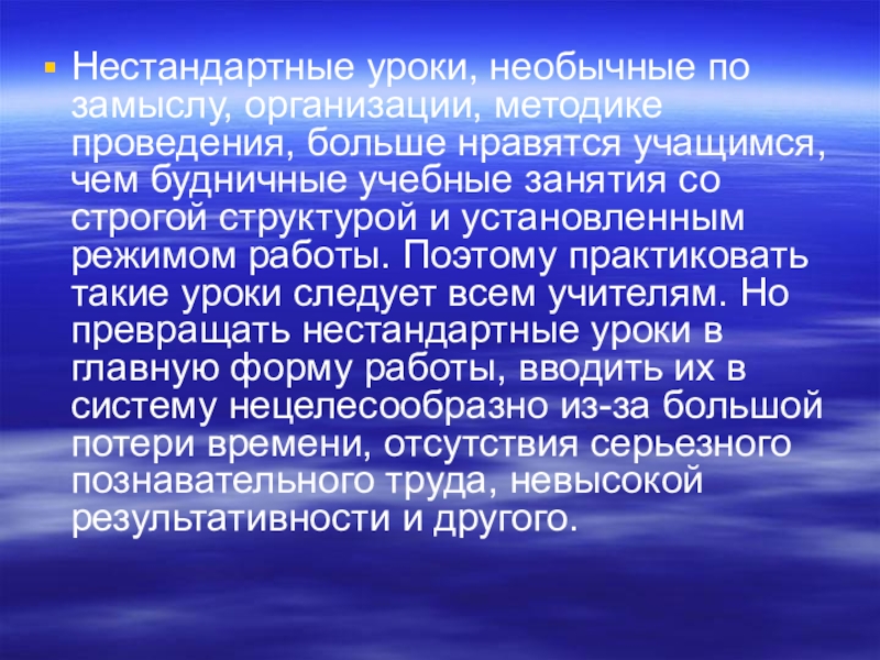чем будничные учебные занятия со строгой структурой и установленным режимом работы. Поэтому практиковать такие уроки следует всем учителям. Но превращать нестандартные уроки в главную форму работы, вводить их в систему нецелесообразно из-за большой потери времени, отсутствия серьезного познавательного труда, невысокой результативности и другого.