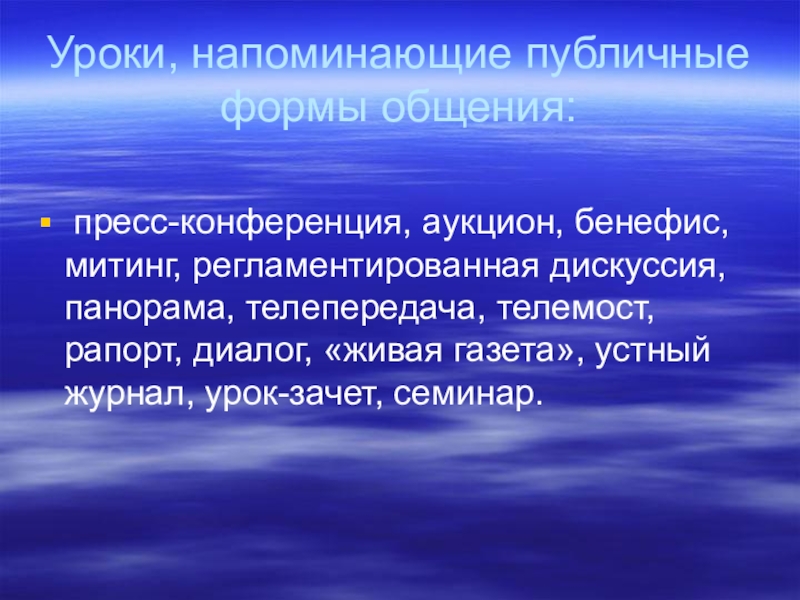 Слайд 5Уроки, напоминающие публичные формы общения: