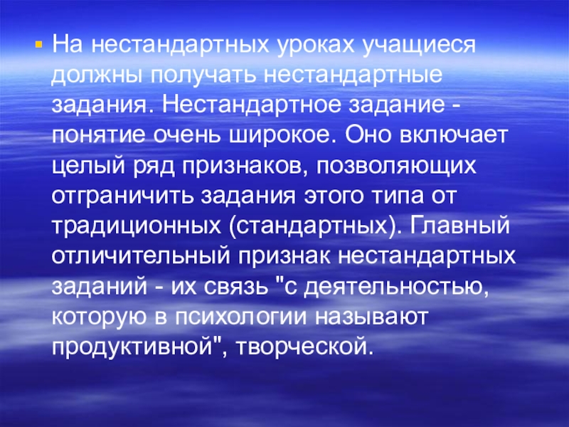 понятие очень широкое. Оно включает целый ряд признаков, позволяющих отграничить задания этого типа от традиционных (стандартных). Главный отличительный признак нестандартных заданий - их связь "с деятельностью, которую в психологии называют продуктивной", творческой.