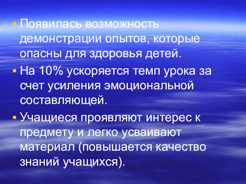 Слайд 9Появилась возможность демонстрации опытов, которые опасны для здоровья детей.