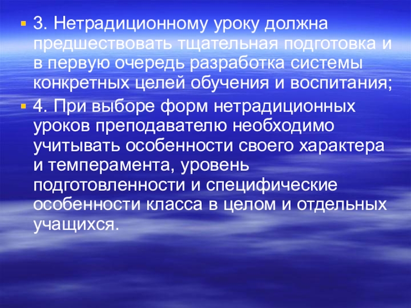 4. При выборе форм нетрадиционных уроков преподавателю необходимо учитывать особенности своего характера и темперамента, уровень подготовленности и специфические особенности класса в целом и отдельных учащихся.