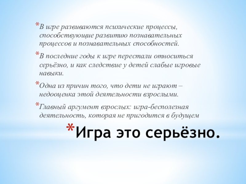 Игра это серьёзно.В игре развиваются психические процессы, способствующие развитию познавательных процессов и познавательных способностей. В последние годы