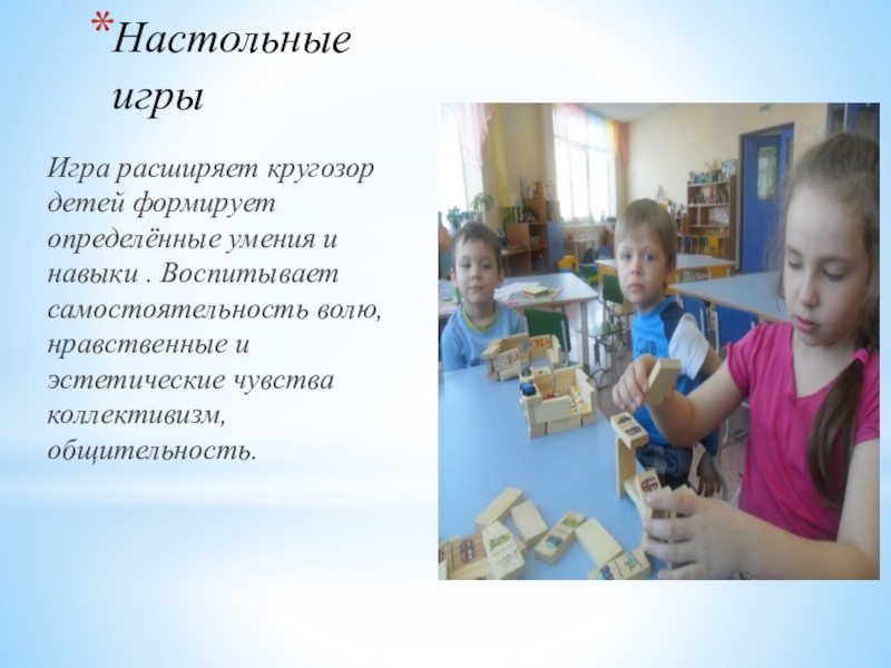 Настольные игрыИгра расширяет кругозор детей формирует определённые умения и навыки . Воспитывает самостоятельность волю, нравственные и эстетические
