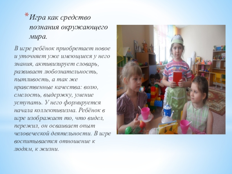 Игра как средство познания окружающего мира.В игре ребёнок приобретает новое и уточняет уже имеющиеся у него знания,