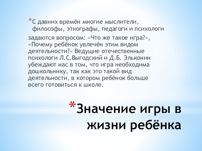 Значение игры в жизни ребёнкаС давних времён многие мыслители, философы, этнографы, педагоги и психологи задаются вопросом: «Что же такое игра?», «Почему ребёнок увлечён этим видом деятельности?» Ведущие отечественные психологи Л.С.Выгодский и Д.Б. Эльконин убеждают нас в