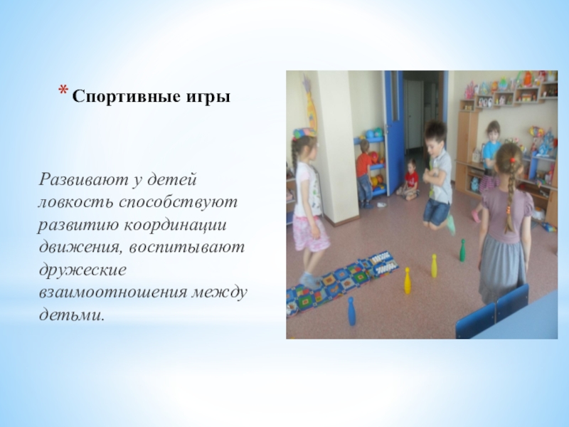 Спортивные игрыРазвивают у детей ловкость способствуют развитию координации движения, воспитывают дружеские взаимоотношения между детьми.