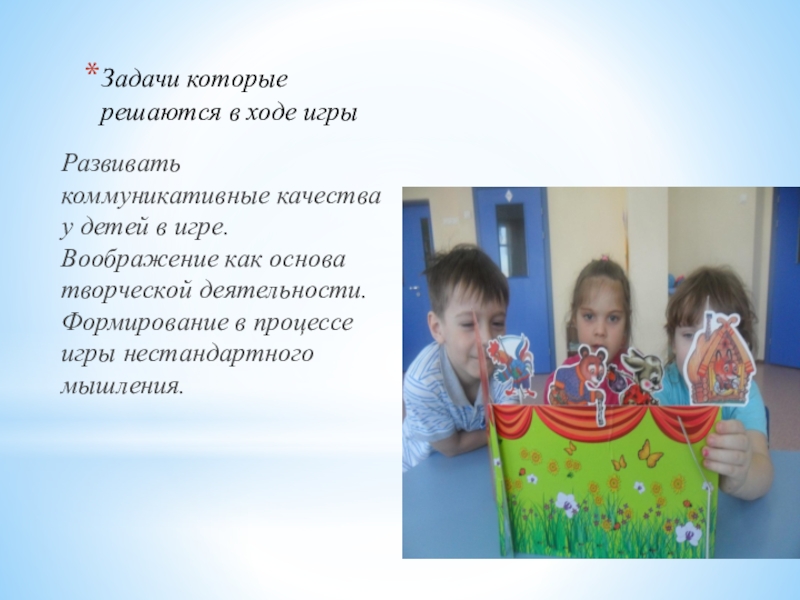 Задачи которые решаются в ходе игрыРазвивать коммуникативные качества у детей в игре. Воображение как основа творческой деятельности.