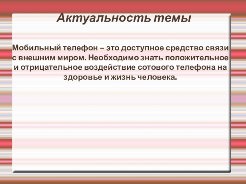 Актуальность темыМобильный телефон – это доступное средство связи с внешним миром. Необходимо знать положительное и отрицательное воздействие
