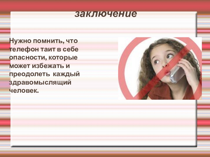 заключениеНужно помнить, что телефон таит в себе опасности, которые может избежать и преодолеть каждый здравомыслящий человек.
