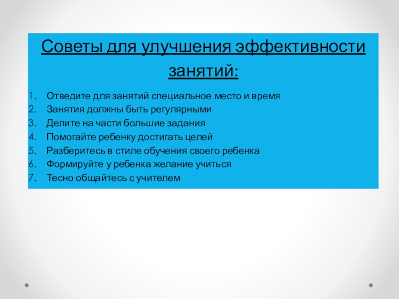 Советы для улучшения эффективности занятий:Отведите для занятий специальное место и времяЗанятия должны быть регулярнымиДелите на части большие заданияПомогайте ребенку достигать целейРазберитесь в стиле обучения своего ребенкаФормируйте у ребенка желание учитьсяТесно общайтесь с учителем