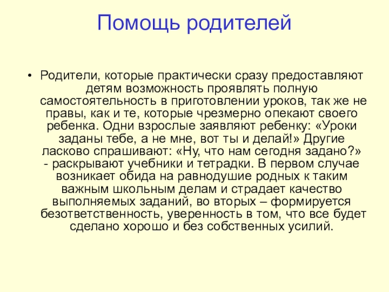 в приготовлении уроков, так же не правы, как и те, которые чрезмерно опекают своего ребенка. Одни взрослые заявляют ребенку: «Уроки заданы тебе, а не мне, вот ты и делай!» Другие ласково спрашивают: «Ну, что нам сегодня задано?» - раскрывают учебники и тетрадки. В первом случае возникает обида на равнодушие родных к таким важным школьным делам и страдает качество выполняемых заданий, во вторых – формируется безответственность, уверенность в том, что все будет сделано хорошо и без собственных усилий.