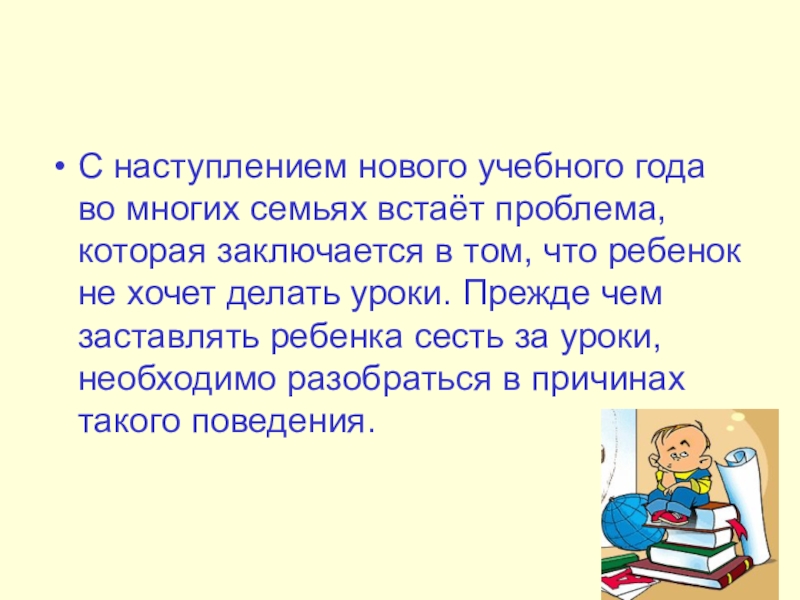 заключается в том, что ребенок не хочет делать уроки. Прежде чем заставлять ребенка сесть за уроки, необходимо разобраться в причинах такого поведения.