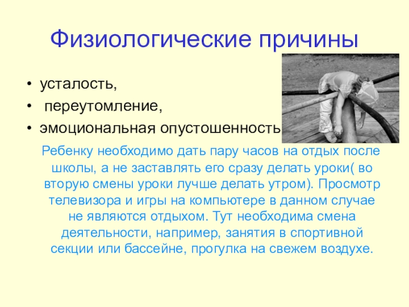 часов на отдых после школы, а не заставлять его сразу делать уроки( во вторую смены уроки лучше делать утром). Просмотр телевизора и игры на компьютере в данном случае не являются отдыхом. Тут необходима смена деятельности, например, занятия в спортивной секции или бассейне, прогулка на свежем воздухе.