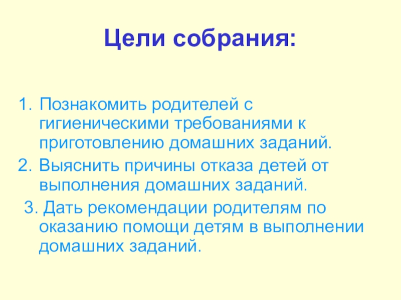 Познакомить родителей с гигиеническими требованиями к приготовлению домашних заданий.