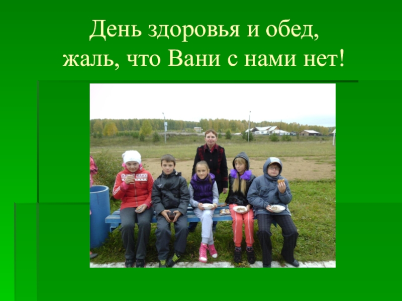 Слайд 6День здоровья и обед, жаль, что Вани с нами нет!