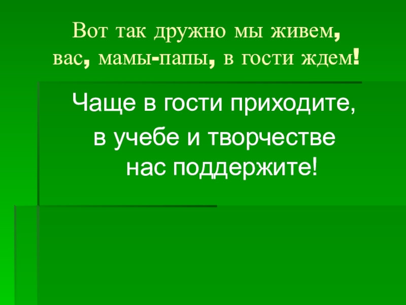 Вот так дружно мы живем, вас, мамы-папы, в гости ждем!Чаще в гости приходите,в учебе и творчестве