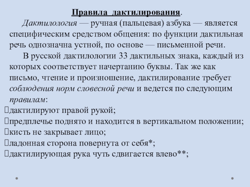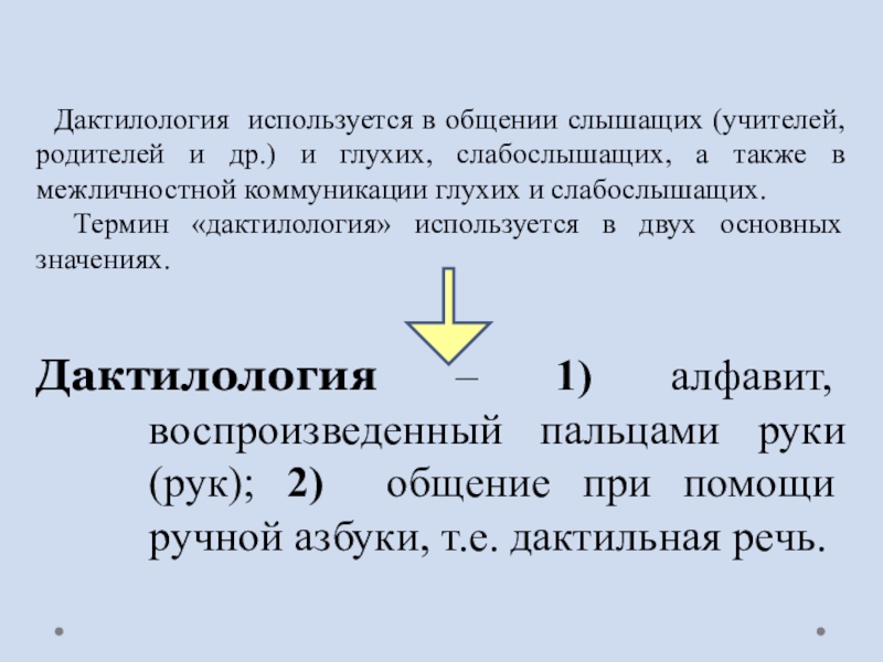 Дактилология используется в общении слышащих (учителей, родителей и др.) и глухих, слабослышащих, а также в межличностной коммуникации глухих и слабослышащих.