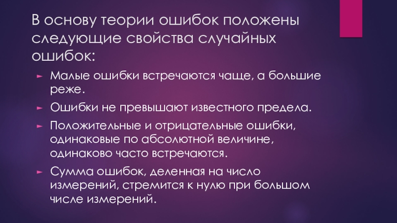 В основу теории ошибок положены следующие свойства случайных ошибок:Малые ошибки встречаются чаще, а большие реже.Ошибки не превышают