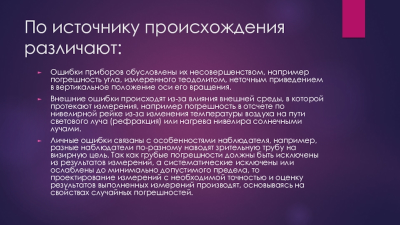 По источнику происхождения различают: Ошибки приборов обусловлены их несовершенством, например погрешность угла, измеренного теодолитом, неточным приведением в