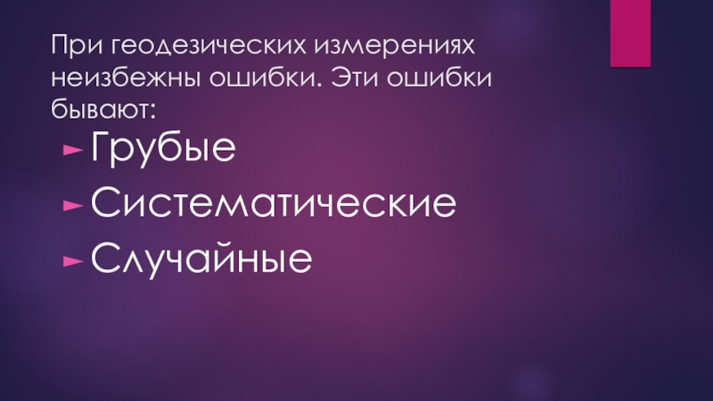 При геодезических измерениях неизбежны ошибки. Эти ошибки бывают:Грубые Систематические Случайные
