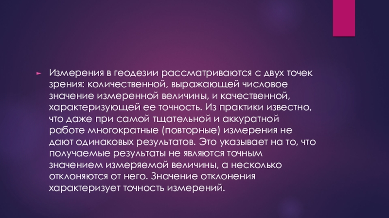 Измерения в геодезии рассматриваются с двух точек зрения: количественной, выражающей числовое значение измеренной величины, и качественной, характеризующей