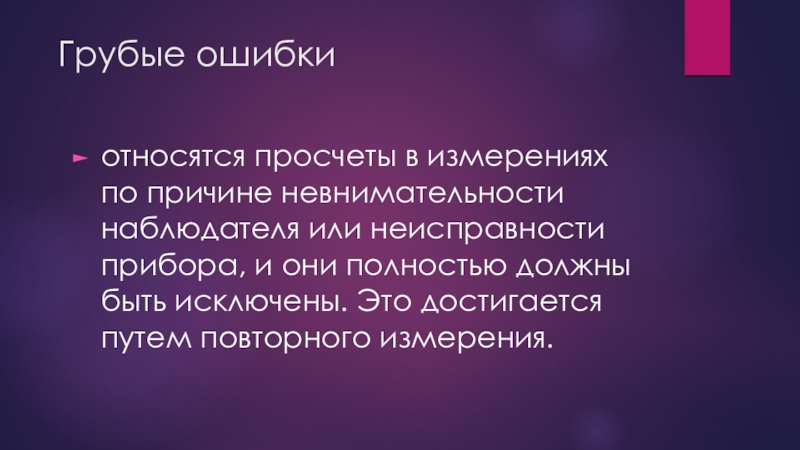 Грубые ошибкиотносятся просчеты в измерениях по причине невнимательности наблюдателя или неисправности прибора, и они полностью должны