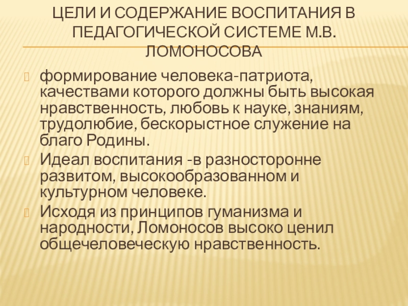 Слайд 5Цели и содержание воспитания в педагогической системе М.В. Ломоносова