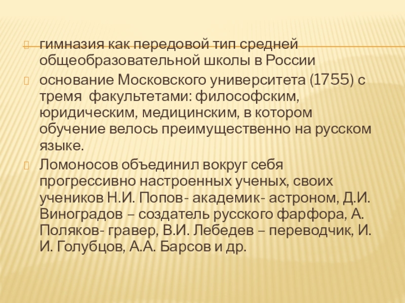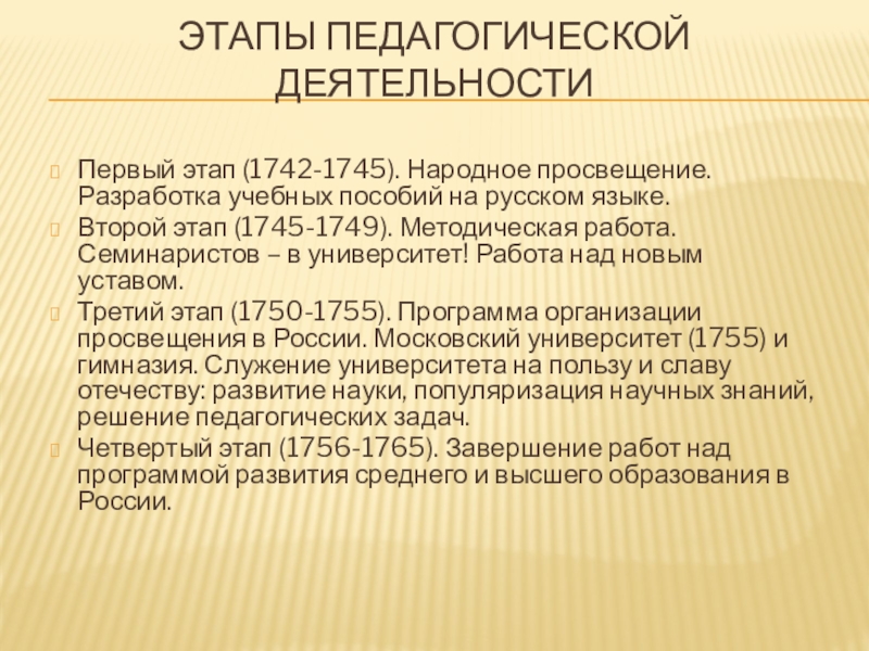 Третий этап (1750-1755). Программа организации просвещения в России. Московский университет (1755) и гимназия. Служение университета на пользу и славу отечеству: развитие науки, популяризация научных знаний, решение педагогических задач.