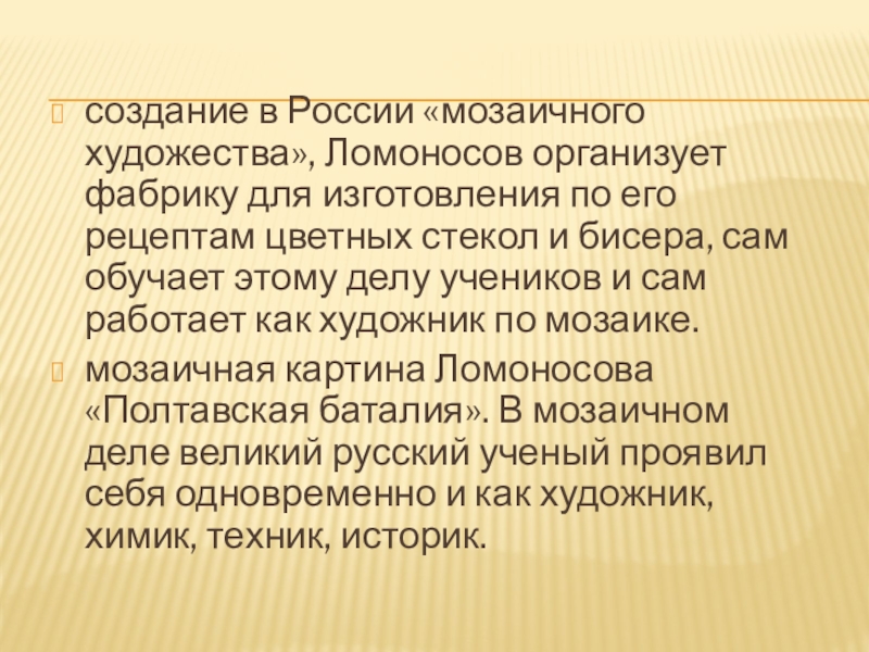 Слайд 16создание в России «мозаичного художества», Ломоносов организует фабрику для изготовления по