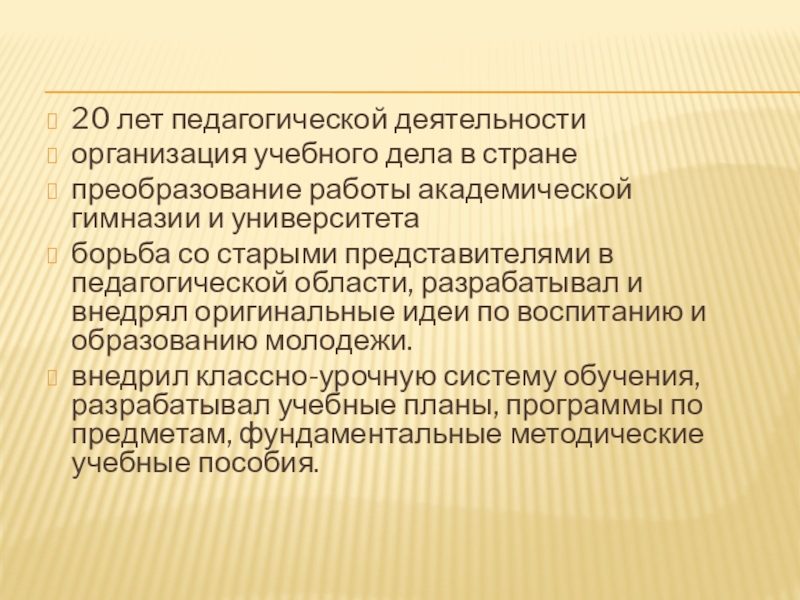 внедрил классно-урочную систему обучения, разрабатывал учебные планы, программы по предметам, фундаментальные методические учебные пособия.
