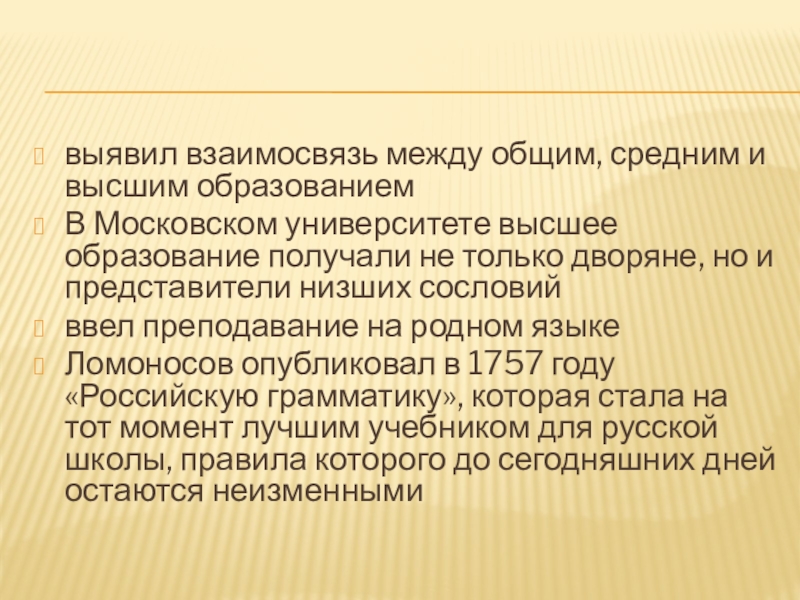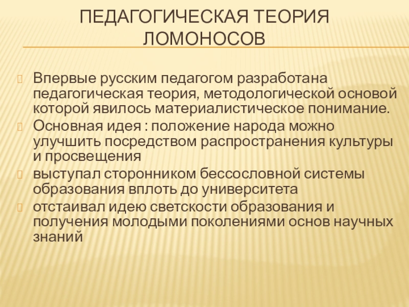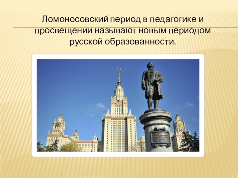 Слайд 18Ломоносовский период в педагогике и просвещении называют новым периодом русской образованности.