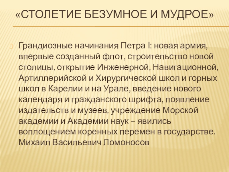 созданный флот, строительство новой столицы, открытие Инженерной, Навигационной, Артиллерийской и Хирургической школ и горных школ в Карелии и на Урале, введение нового календаря и гражданского шрифта, появление издательств и музеев, учреждение Морской академии и Академии наук – явились воплощением коренных перемен в государстве. Михаил Васильевич Ломоносов