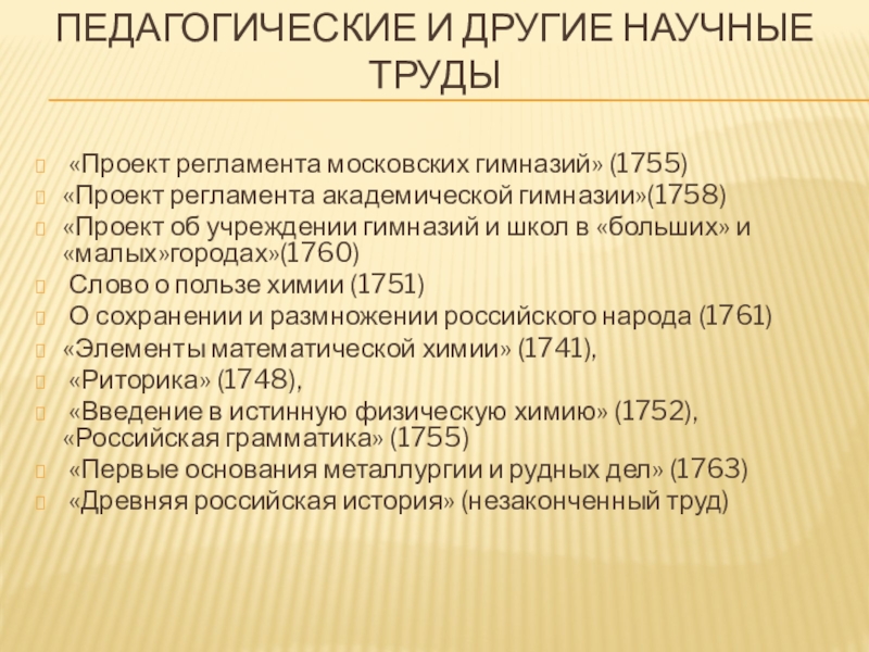 «Введение в истинную физическую химию» (1752), «Российская грамматика» (1755)