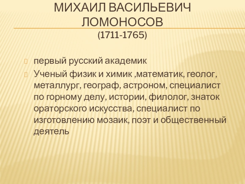 металлург, географ, астроном, специалист по горному делу, истории, филолог, знаток ораторского искусства, специалист по изготовлению мозаик, поэт и общественный деятель