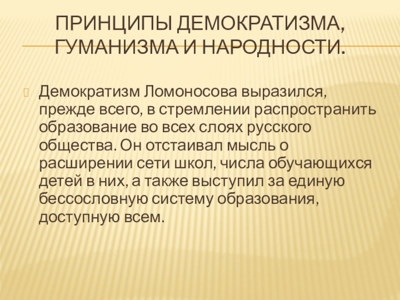 Демократизм Ломоносова выразился, прежде всего, в стремлении