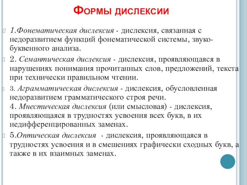 1.Фонематическая дислексия - дислексия, связанная с недоразвитием функций фонематической системы,