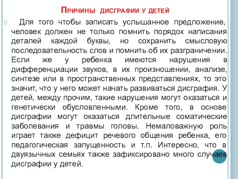 должен не только помнить порядок написания деталей каждой буквы, но сохранить смысловую последовательность слов и помнить об их разграничении. Если же у ребенка имеются нарушения в дифференциации звуков, в их произношении, анализе, синтезе или в пространственных представлениях, то это значит, что у него может начать развиваться дисграфия. У детей, между прочим, такие нарушения могут оказаться и генетически обусловленными. Кроме того, в основе дисграфии могут оказаться длительные соматические заболевания и травмы головы. Немаловажную роль играет также дефицит речевого общения ребенка, его педагогическая запущенность и т.п. Интересно, что в двуязычных семьях также зафиксировано много случаев дисграфии у детей.