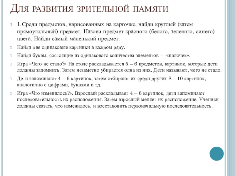 Игра «Чего не стало?» На столе раскладывается 5 – 6 предметов, картинок, которые дети должны запомнить. Затем незаметно убирается одна из них. Дети называют, чего не стало.