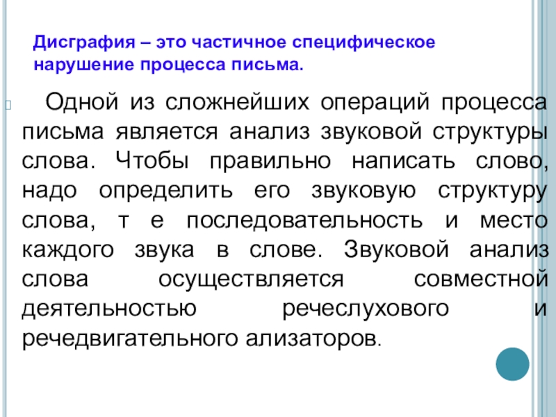 Слайд 4 Одной из сложнейших операций процесса письма является анализ звуковой