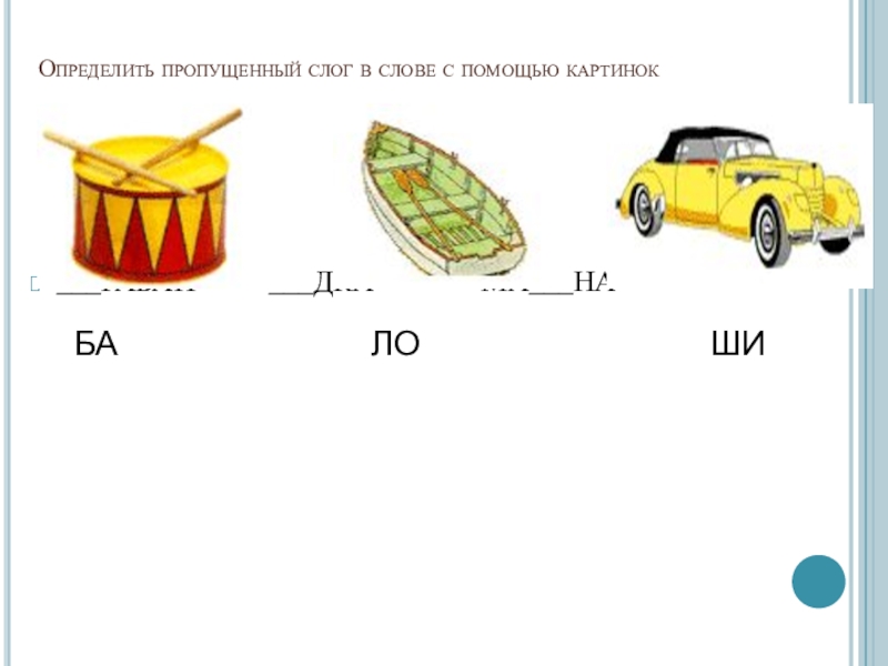 Слайд 25Определить пропущенный слог в слове с помощью картинок