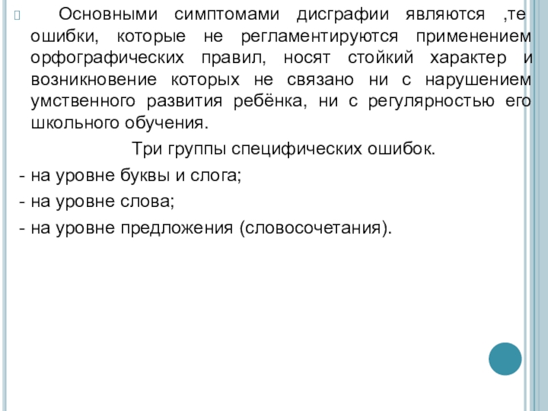 Слайд 8 Основными симптомами дисграфии являются ,те ошибки, которые не регламентируются применением