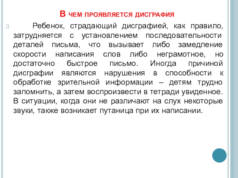 с установлением последовательности деталей письма, что вызывает либо замедление скорости написания слов либо неграмотное, но достаточно быстрое письмо. Иногда причиной дисграфии являются нарушения в способности к обработке зрительной информации – детям трудно запомнить, а затем воспроизвести в тетради увиденное. В ситуации, когда они не различают на слух некоторые звуки, также возникает путаница при их написании.