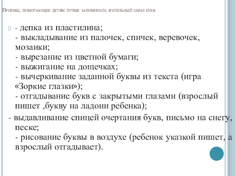 Слайд 33Приемы, помогающие детям лучше запоминать зрительный образ букв