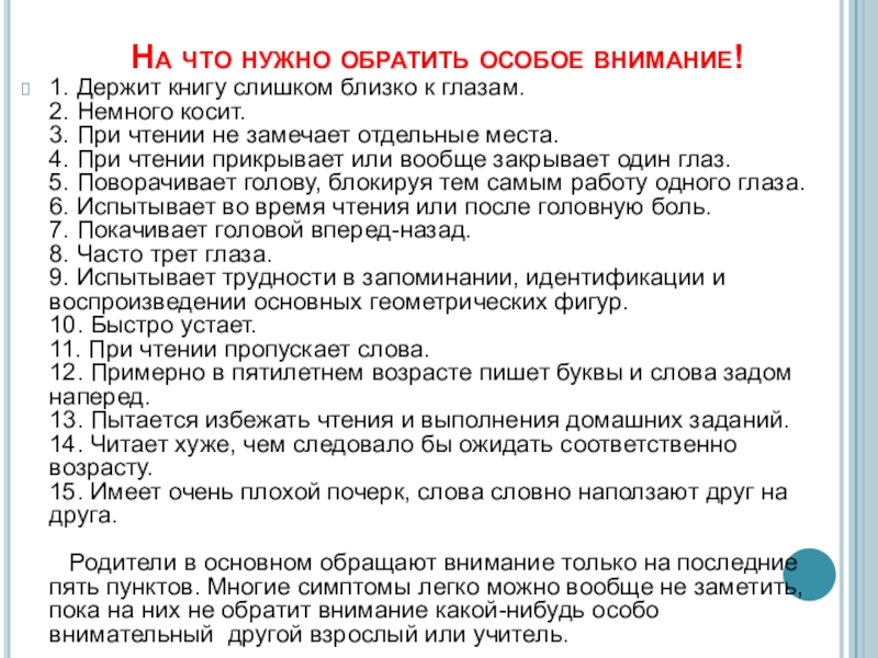 4. При чтении прикрывает или вообще закрывает один глаз.