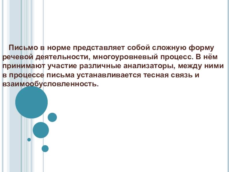 речевой деятельности, многоуровневый процесс. В нём принимают участие различные анализаторы, между ними в процессе письма устанавливается тесная связь и взаимообусловленность.