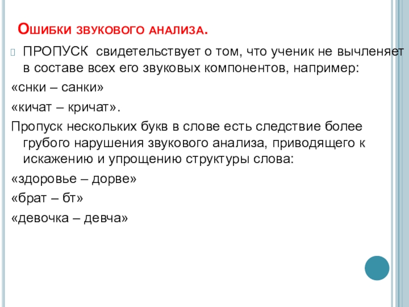 Пропуск нескольких букв в слове есть следствие более грубого нарушения звукового анализа, приводящего к искажению и упрощению структуры слова: