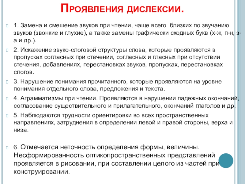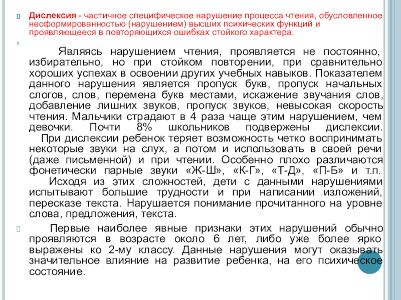 Являясь нарушением чтения, проявляется не постоянно, избирательно, но при стойком повторении, при сравнительно хороших успехах в освоении других учебных навыков. Показателем данного нарушения является пропуск букв, пропуск начальных слогов, слов, перемена букв местами, искажение звучания слов, добавление лишних звуков, пропуск звуков, невысокая скорость чтения. Мальчики страдают в 4 раза чаще этим нарушением, чем девочки. Почти 8% школьников подвержены дислексии.