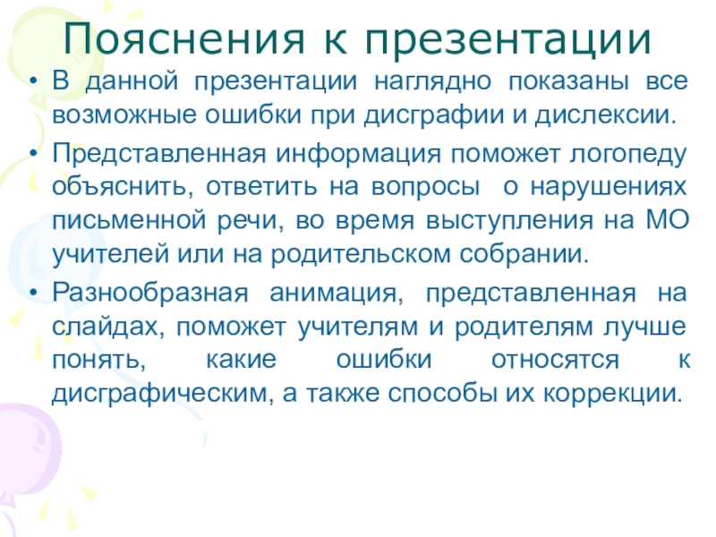 Представленная информация поможет логопеду объяснить, ответить на вопросы о нарушениях письменной речи, во время выступления на МО учителей или на родительском собрании.