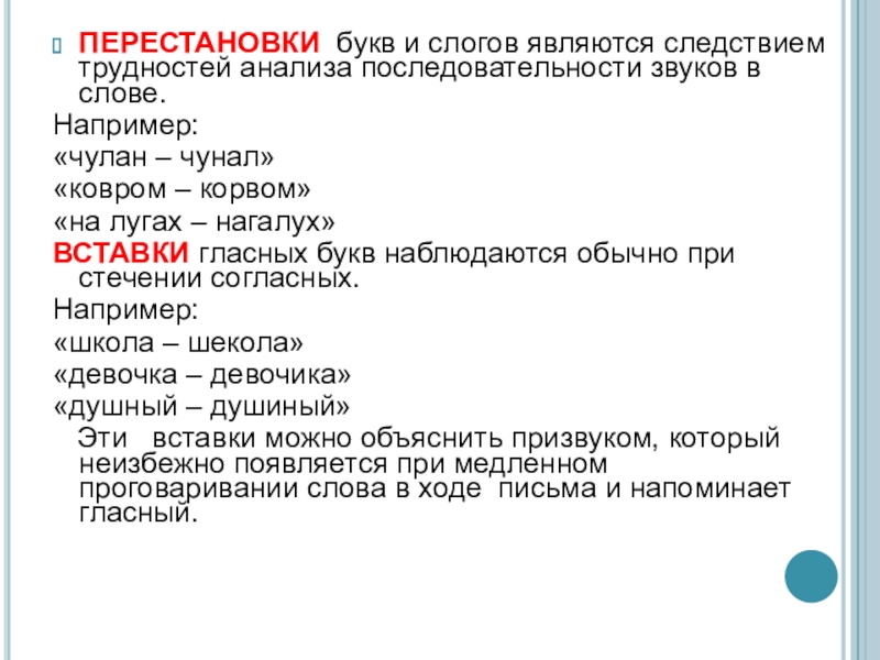 Слайд 10ПЕРЕСТАНОВКИ букв и слогов являются следствием трудностей анализа последовательности звуков в